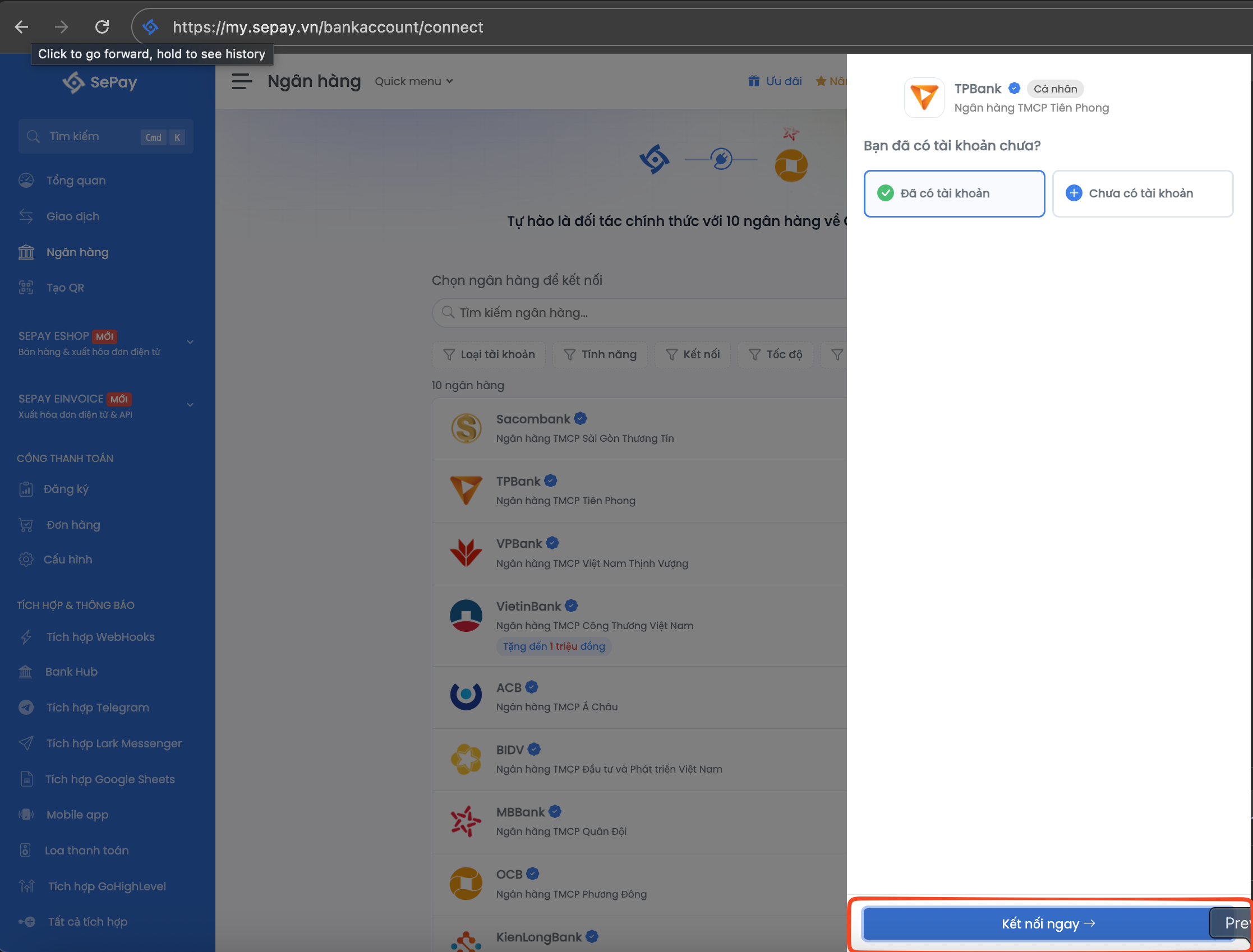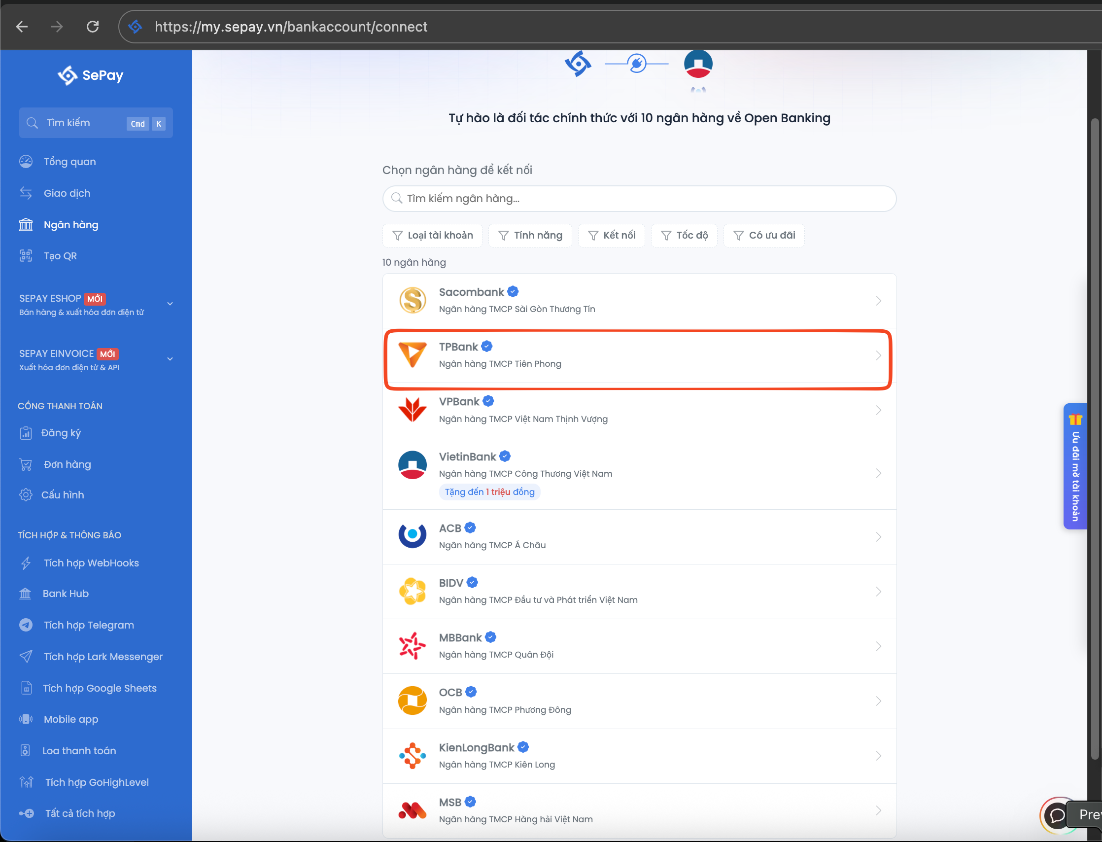 Hướng dẫn kết nối tài khoản TPBank vào SePay