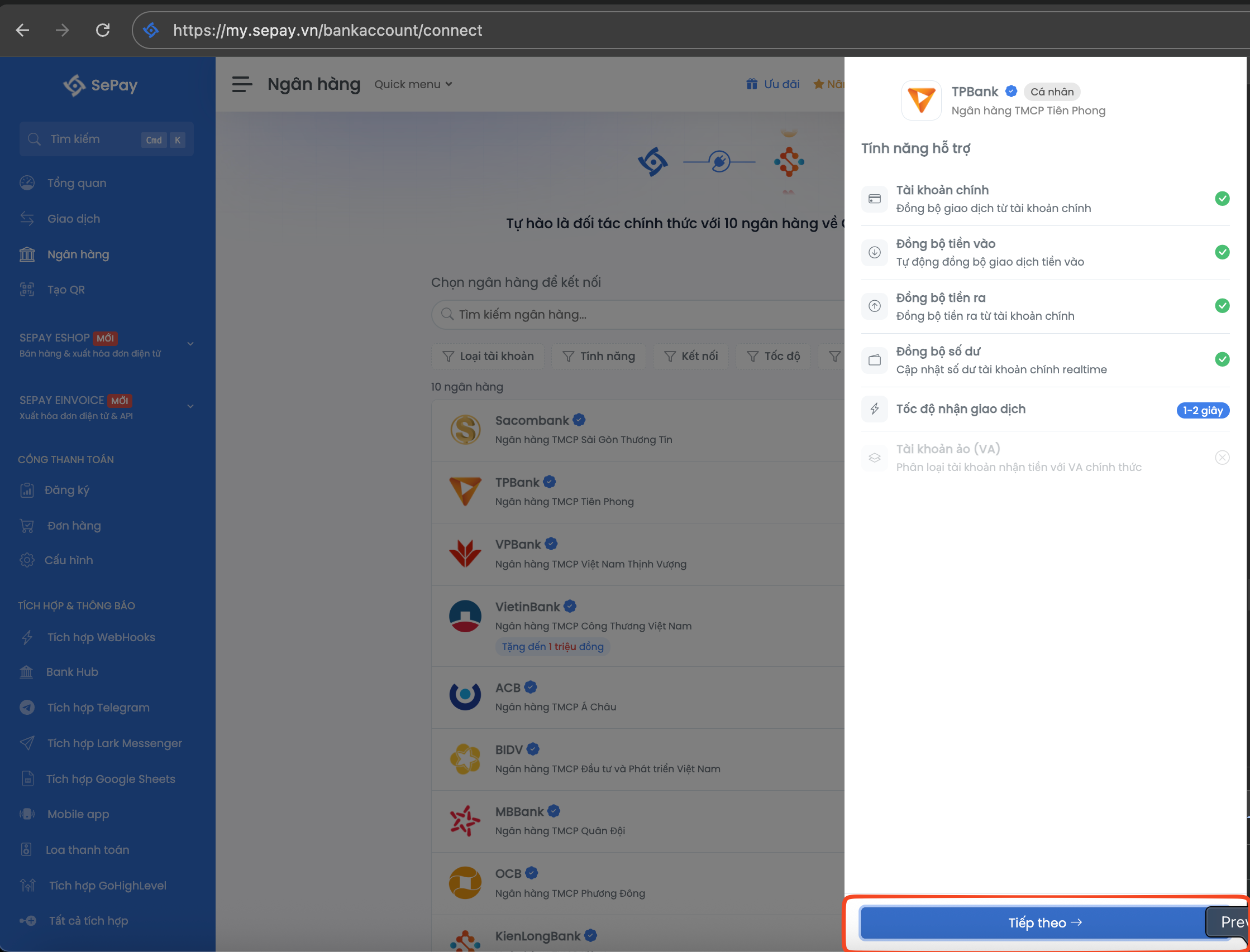 Sau đây là các bước kết nối API Ngân hàng TPBank doanh nghiệp vào SePay: