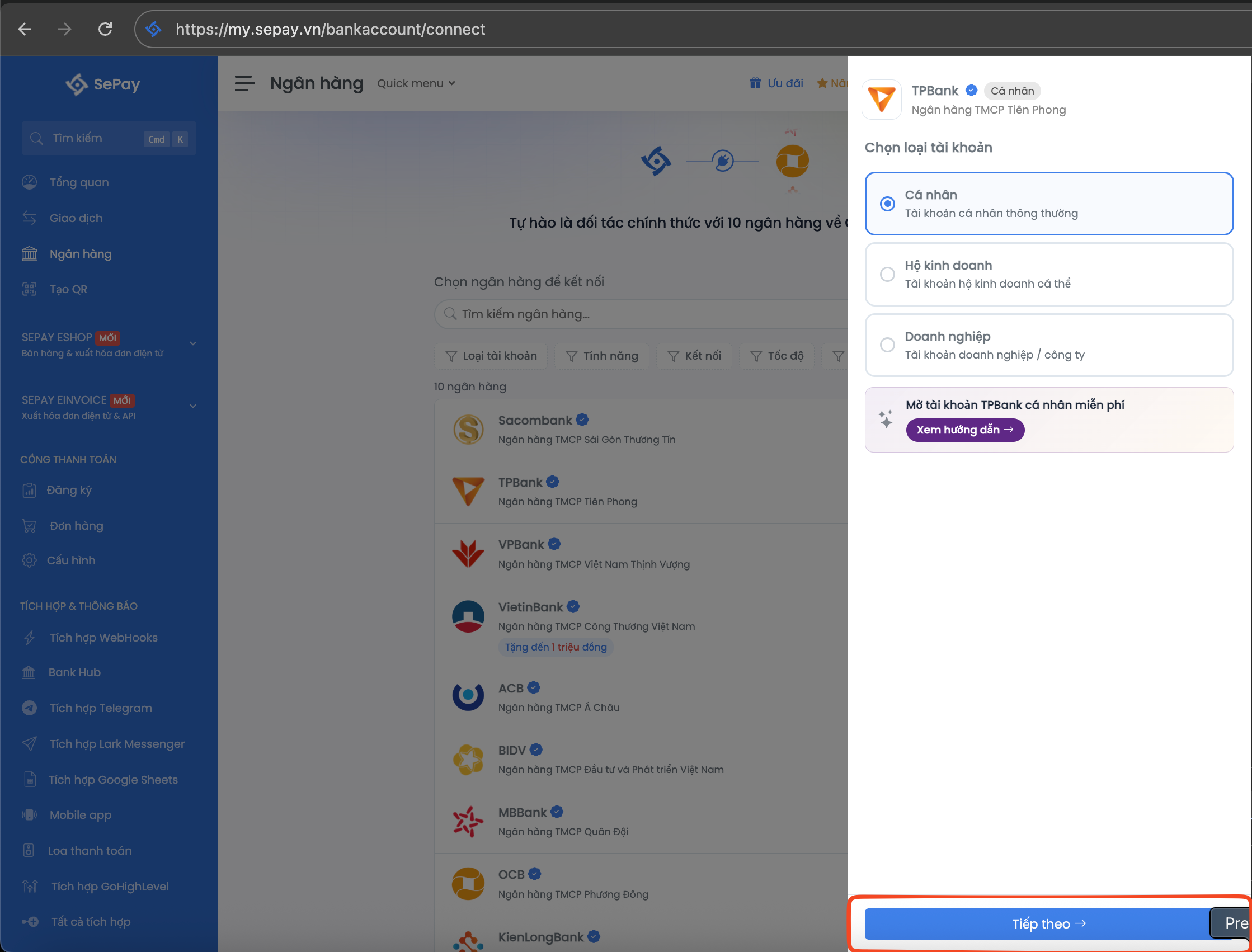 Sau đây là các bước kết nối API Ngân hàng TPBank cá nhân vào SePay: