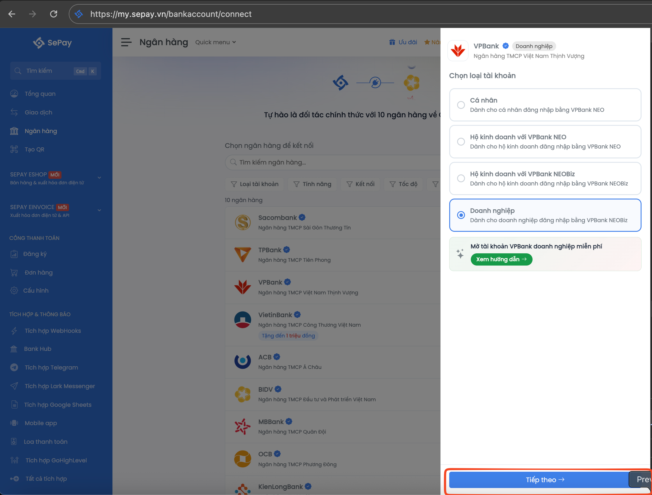 Hướng dẫn kết nối Ngân Hàng VPBank cho doanh nghiệp