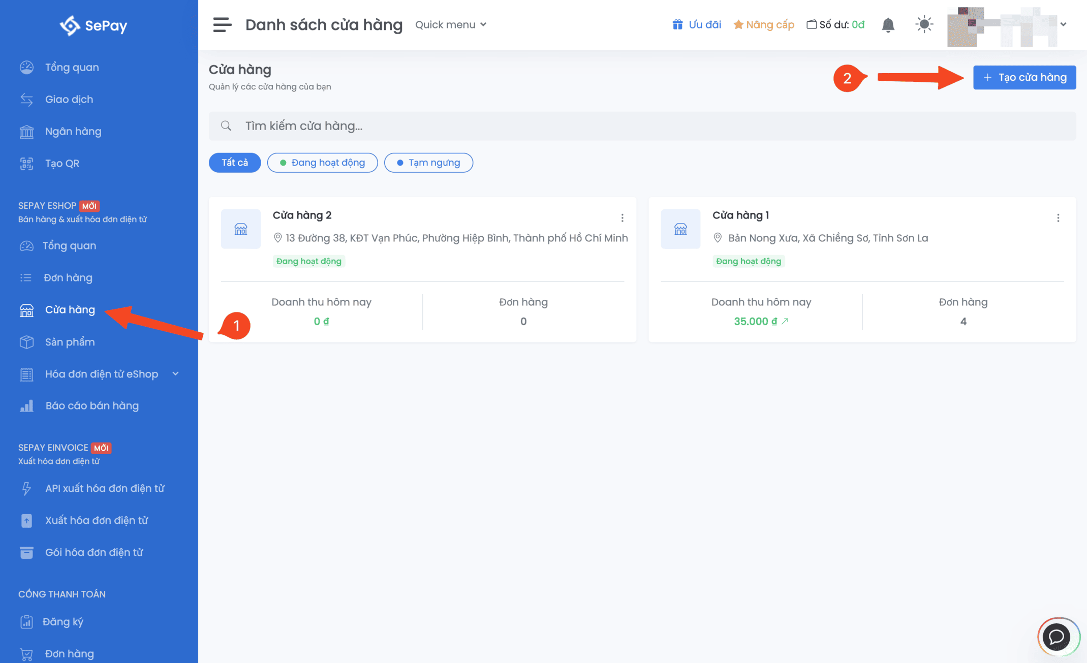 Tính năng cửa hàng cho phép bạn tạo và quản lý nhiều cửa hàng trên cùng một tài khoản SePay. Mỗi cửa hàng có thể có danh mục sản phẩm, đơn hàng và hoá đơn riêng, giúp bạn dễ dàng quản lý nhiều điểm bán khác nhau.