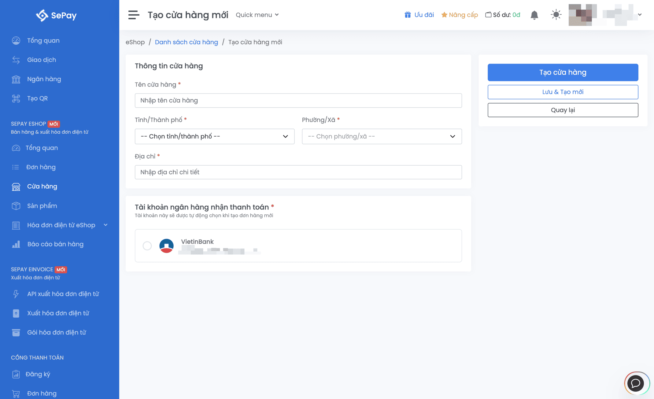 Bạn có thể tạo nhiều cửa hàng trên cùng một tài khoản SePay. Điều này rất hữu ích nếu bạn có nhiều điểm bán hoặc muốn tách biệt các loại hình kinh doanh khác nhau.