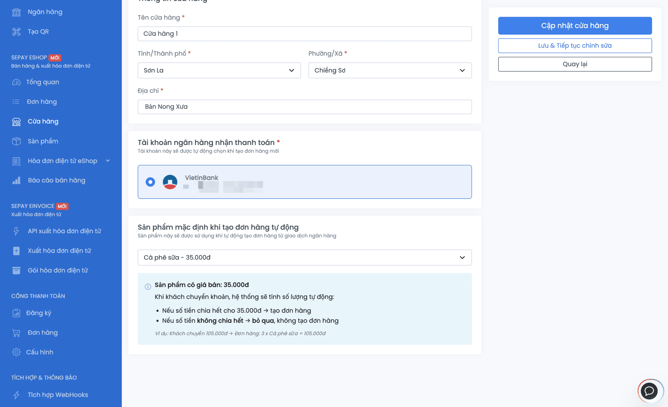 Ví dụ: Nếu sản phẩm mặc định có giá bán 3.000₫ và khách chuyển khoản 9.000₫, hệ thống sẽ tự động tạo hóa đơn với số lượng 3 sản phẩm (3 x 3.000₫ = 9.000₫).