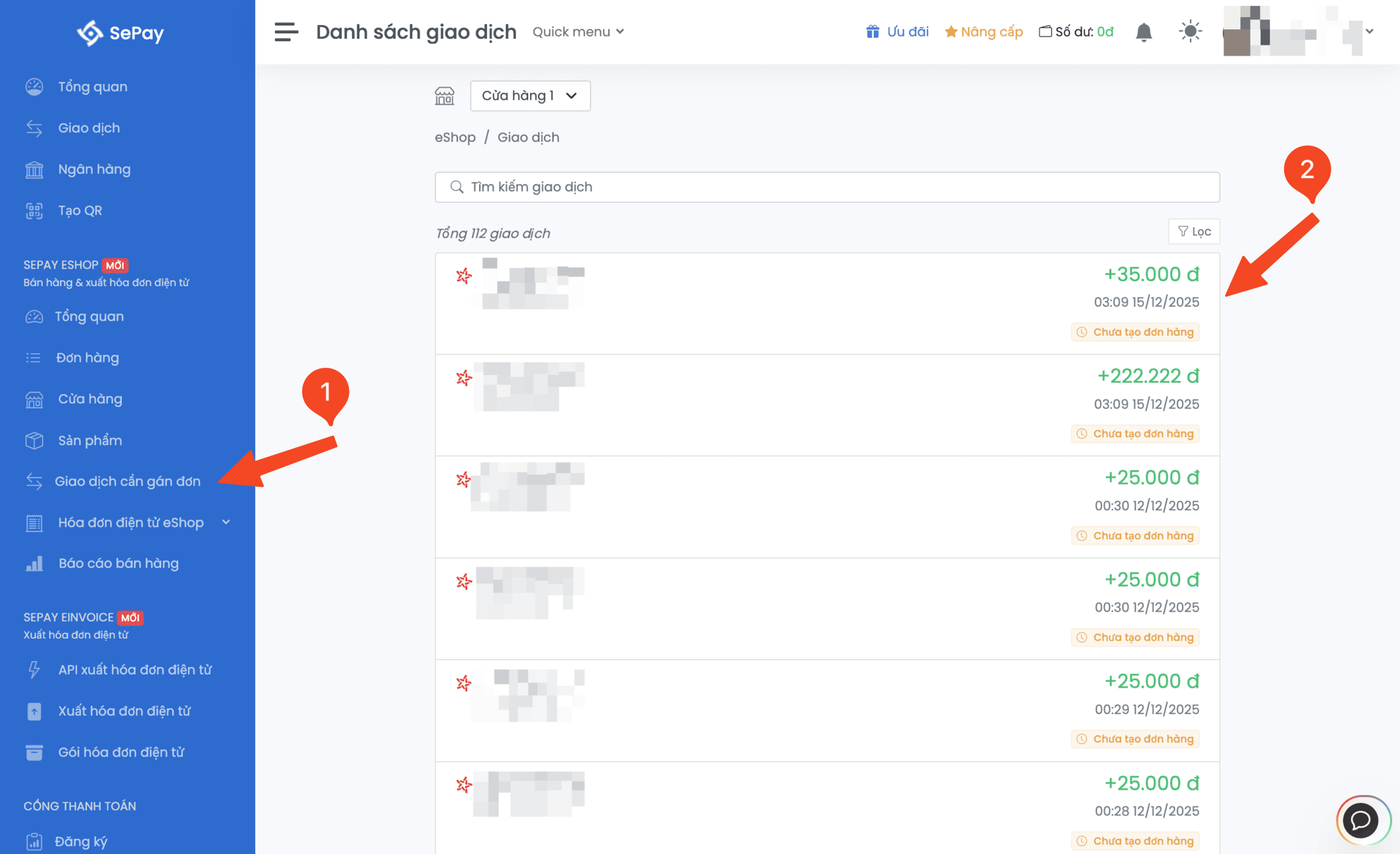 Sau khi đăng nhập vào tài khoản SePay, chọn mục Giao dịch cần gán đơn trong phần SEPAY ESHOP của thanh menu sidebar. Hệ thống sẽ hiển thị danh sách tất cả các giao dịch chưa được gán hoá đơn điện tử. Bạn có thể xem thông tin cơ bản của từng giao dịch như số tiền, thời gian, và trạng thái. Từ danh sách này, chọn giao dịch mà bạn muốn xử lý để xem chi tiết hoặc thực hiện các thao tác tiếp theo.