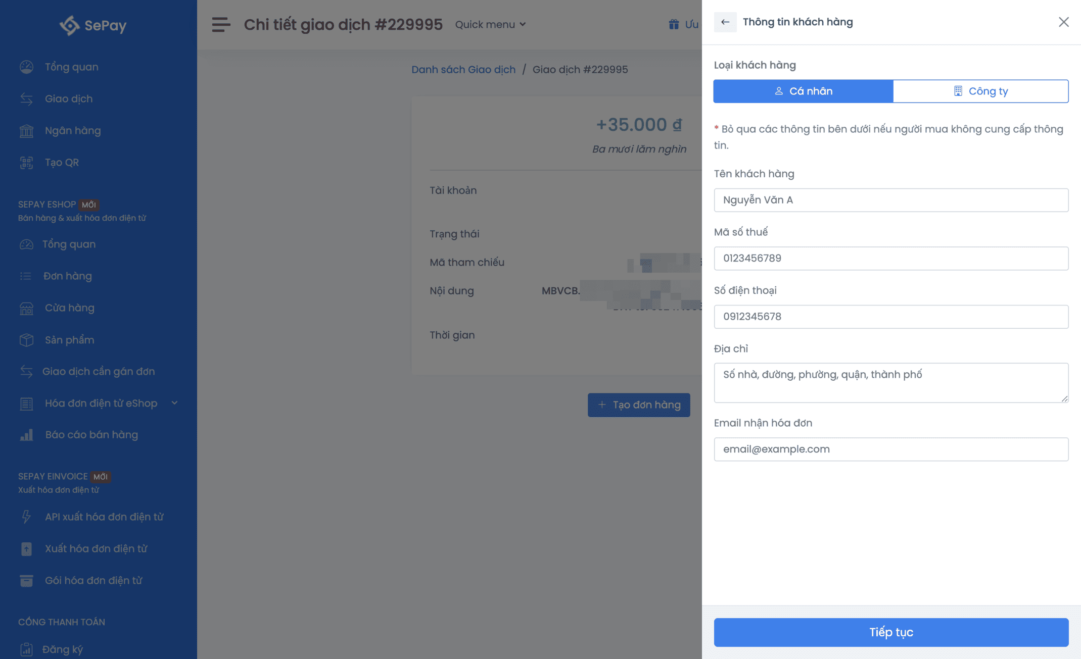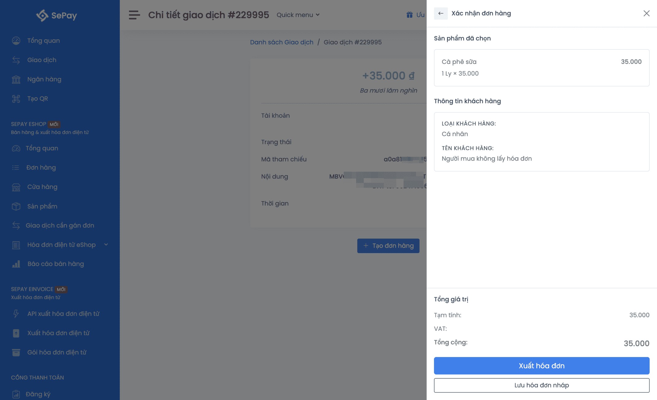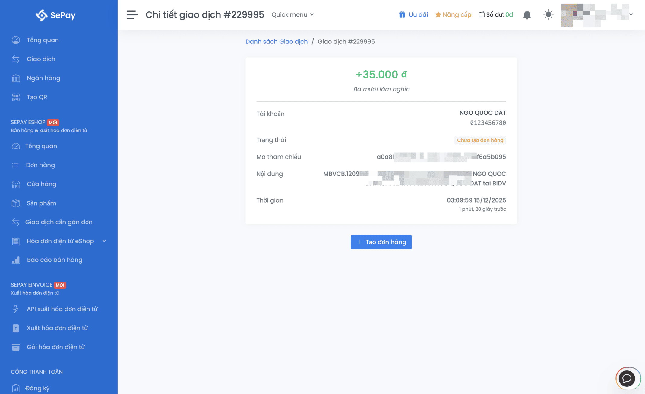 Sau khi chọn giao dịch, hệ thống sẽ hiển thị chi tiết thông tin giao dịch bao gồm số tiền, thời gian, phương thức thanh toán, và thông tin người gửi. Bạn cần kiểm tra kỹ thông tin này trước khi tiến hành tạo đơn hàng và xuất hoá đơn.