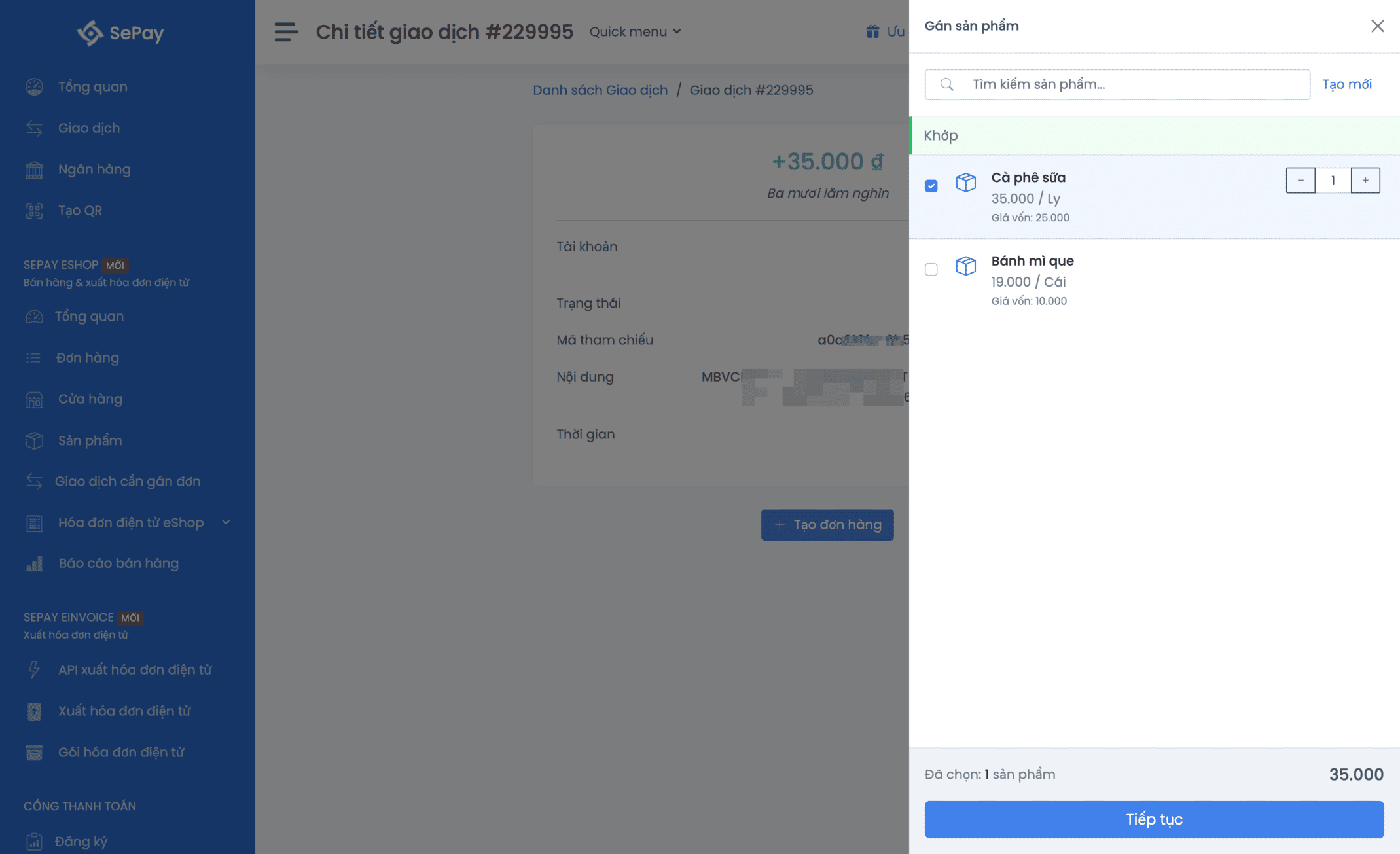 Sau khi xem chi tiết và xác nhận thông tin giao dịch, bạn có thể tạo đơn hàng từ giao dịch chưa gắn hoá đơn. Bạn sẽ cần chọn cửa hàng, thêm sản phẩm, và điền thông tin khách hàng. Sau khi tạo đơn hàng, bạn có thể xuất hoá đơn điện tử cho đơn hàng đó.