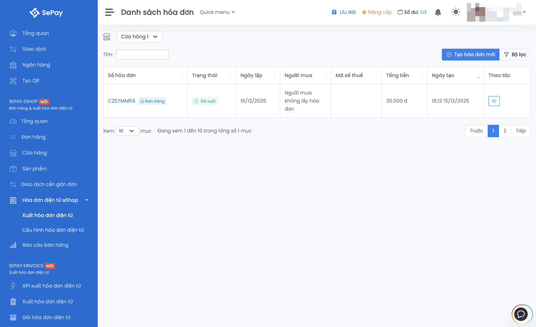 Lưu ý: Để sử dụng tính năng này, bạn cần đã cấu hình hoá đơn điện tử và có ít nhất một cửa hàng trong hệ thống. Vui lòng xem hướng dẫn cấu hình hoá đơn điện tử và tạo cửa hàng nếu chưa thực hiện.